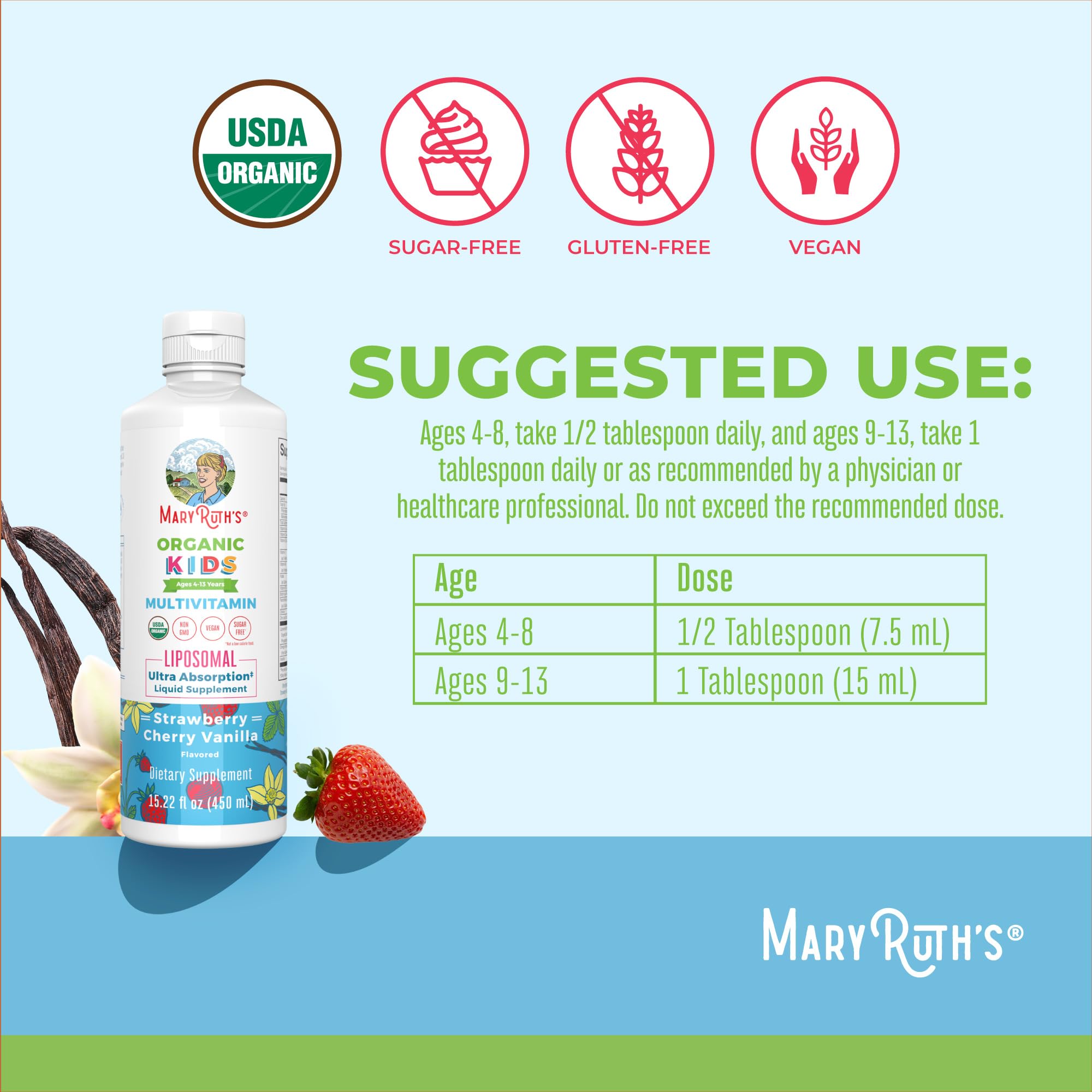 - MaryRuth's Kids Multivitamin Liposomal: With 3 flavors in one bottle: Strawberry Cherry & Vanilla, this vegan multivitamin is formulated to support your child's daily health! Just one serving per day provides your child with vitamin A, vitamin C, vitamin D3, B12, Zinc, and more.